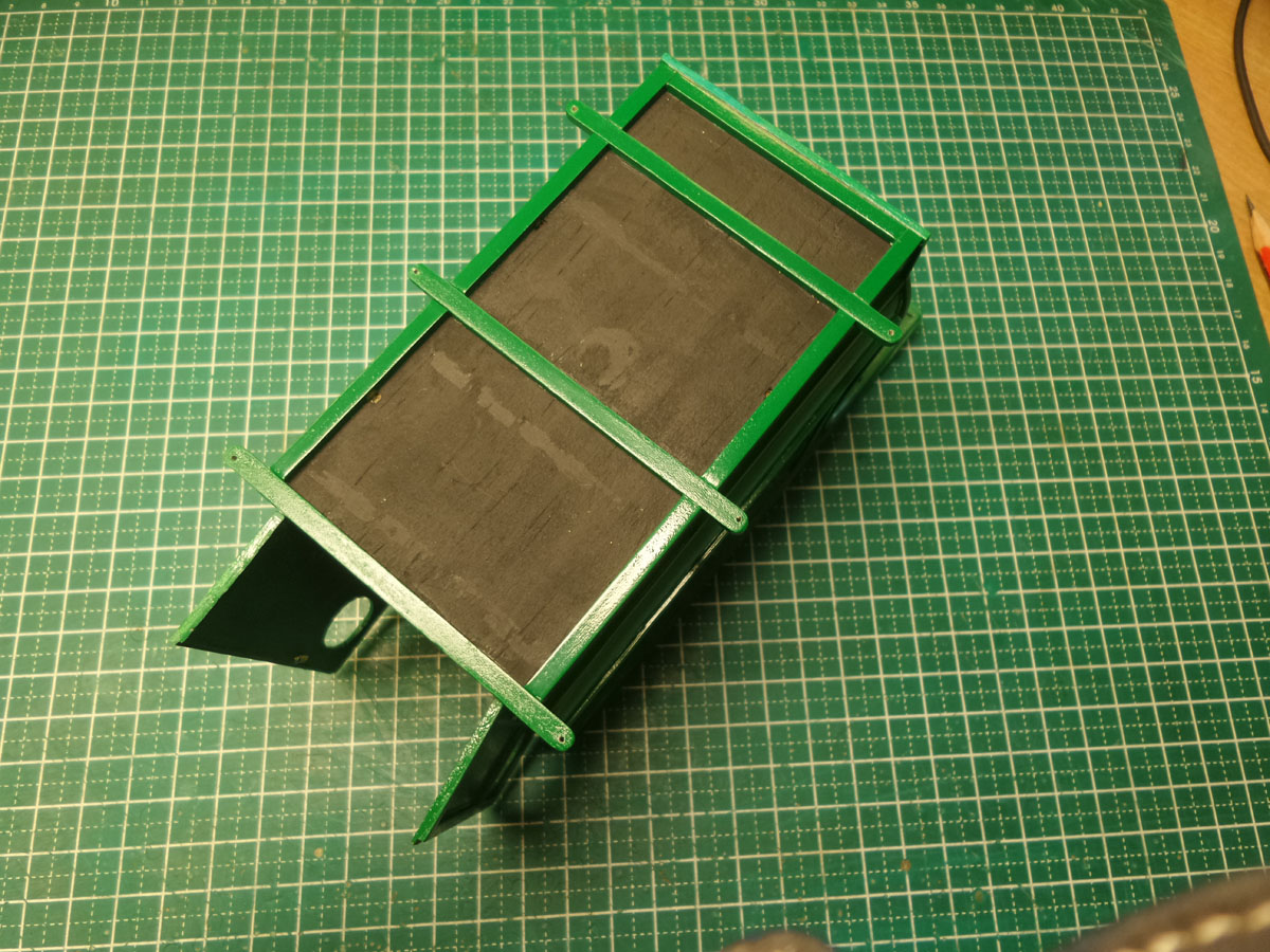 Сделал каркас днища фургона, предварительно покрасив рейки. Так же заранее покрасил и само днище в черный цвет.